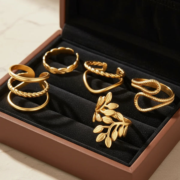 A beautifully balanced collection of five adjustable stainless-steel rings, offered in radiant 18K gold-plated or timeless silver tones. A minimalist essential set designed for sophisticated, everyday versatility.